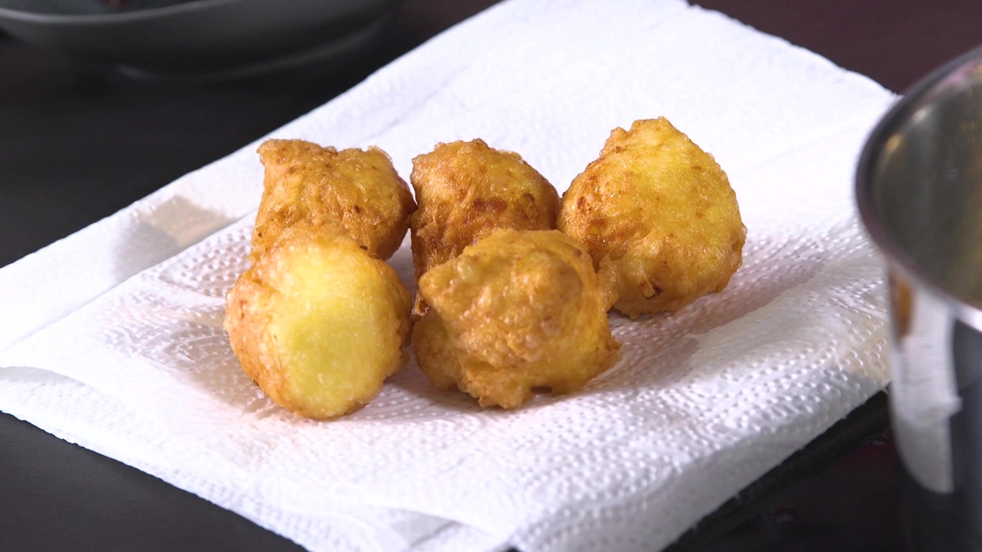 Rühren Sie so lange, bis sich eine leicht weiße Schicht am Topfboden bildet und geben dann die Eier zur Masse. Rühren, rühren, rühren, bis die Masse homogen erscheint. Anschließend pressen Sie die gekochten Kartoffeln und fügen Sie sie ebenso hinzu. Anschließend in 170 Grad (nicht heißer!) heißem Öl frittieren, bis die Rohlinge goldbraun sind.